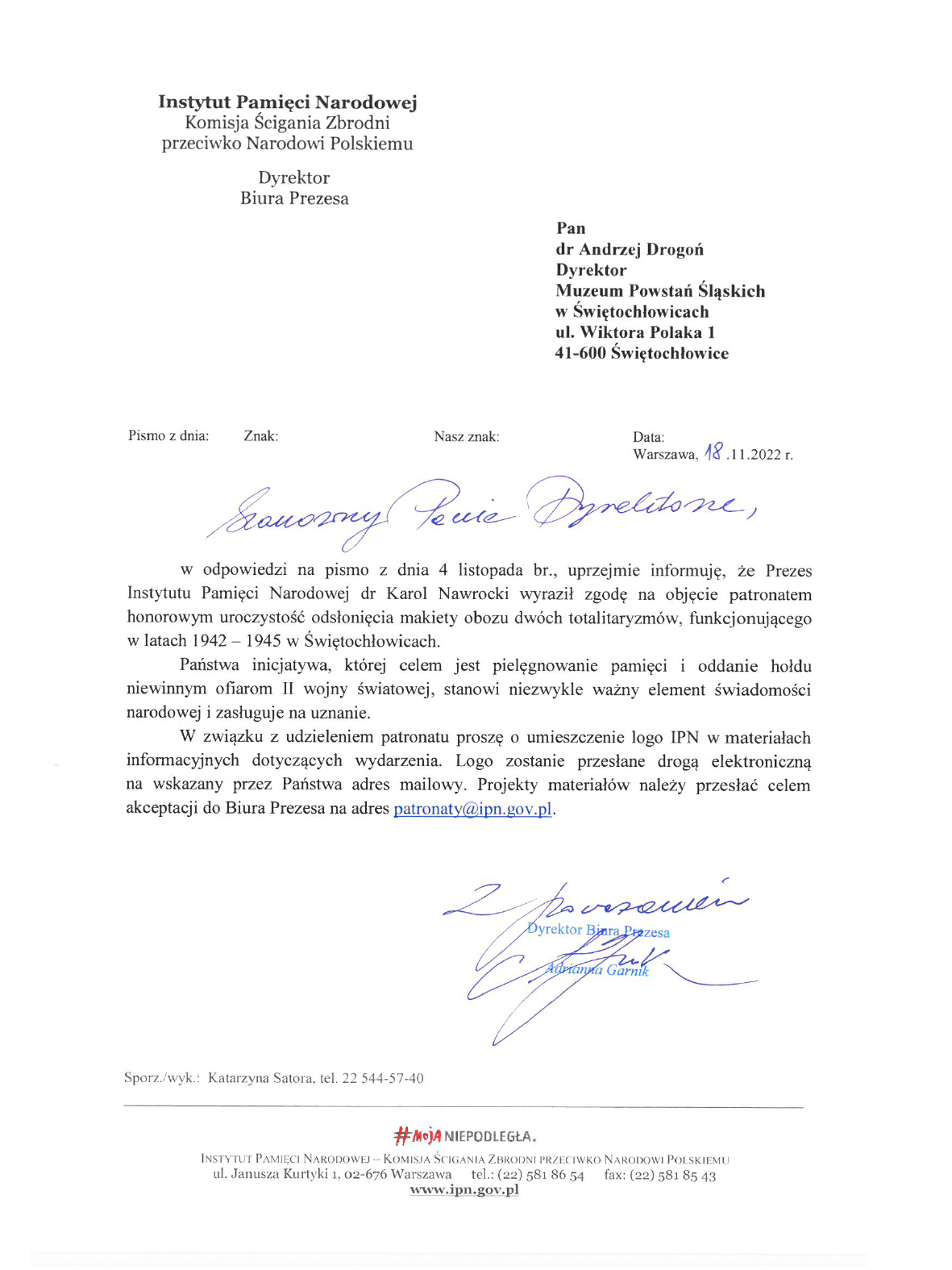 Instytutu Pamięci Narodowej przyjął propozycję patronatu honorowego nad