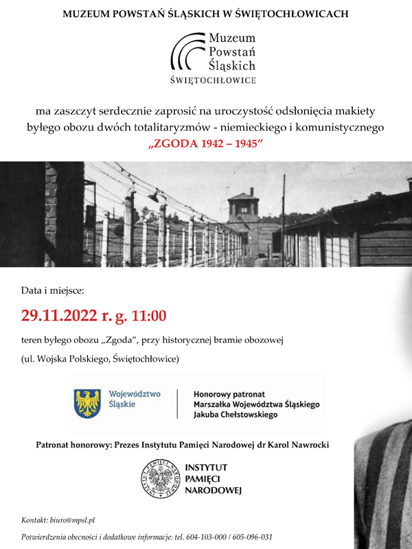 Już 29 listopada spotkamy się przy historycznej bramie obozowej świętochłowickiego obozu dwóch totalitaryzmów. Głównym punktem uroczystości stanie się odsłonięcie makiety przedstawiającej obóz wg stanu z ostatniego okresu funkcjonowania. Obiekt wykonany w technologii odlewniczej przygotowany wg wcześniejszego projektu rzeźbiarza Tomasza Wenklara stanie po lewej stronie bramy. Zapraszamy wszystkich zainteresowanych, którym historia leży na sercu, a pamięć jest bliska i ważna na różnych polach.