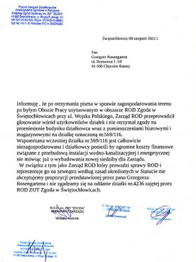 Niestety, wstępne deklaracje przedstawiciela Zarządu ROD „ZUT Zgoda” obiecujące pełną współpracę przy realizacji postanowień listu intencyjnego o stworzeniu miejsca pamięci poświęconego Ofiarom „Zgody” okazały się bez potwierdzenia w faktycznych działaniach podejmowanych w temacie. Wobec aktualnego zaistniałego stanu rzeczy, pełnomocnicy Dyrektora Muzeum Powstań Śląskich do Spraw Miejsca Pamięci „Zgoda” Piotr Owcarz i Grzegorz Rosengarten wystąpią do Prezydenta Miasta Świętochłowice w prośbą o mediacje w przedmiotowej kwestii, by możliwa była realizacja zagospodarowania terenu po byłym obozie.