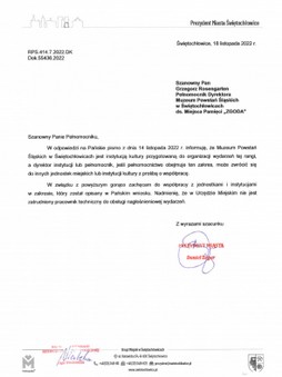Na złożoną w kancelarii Urzędu Miasta Świętochłowice oraz adresowaną na Prezydenta Daniela Begera prośbę o pomoc w organizacji uroczystości odsłonięcia makiety, została przekazana odpowiedź, która stawia po raz kolejny pod znakiem zapytania dalszą współpracę w zakresie upamiętnienia terenu po byłym obozie. Dotyczy to stworzenia tam miejsca pamięci, zgodnie z podpisanym we wrześniu 2021 roku postanowieniami listu intencyjnego.