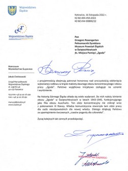 Patronat honorowy Marszałka Województwa Śląskiego nad uroczystością odsłonięcia makiety w dniu 29 listopada został przyznany w złożony odpowiedni wniosku. W uzasadnieniu podkreślona znacząco została historyczna rola projektu upamiętnienia byłego obozu dwóch totalitaryzmów – niemieckiego i komunistycznego, oraz jej znaczenie dla dziejów Górnego Śląska.
